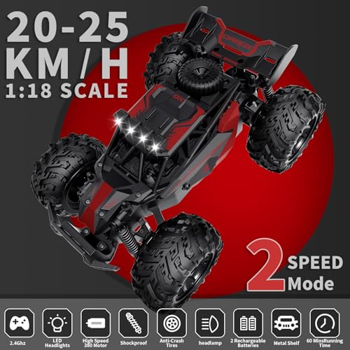 Remote Control Car, 2.4GHz 20-25KM/H Variable Speed Turbo 2-Speed Acceleration High Speed RC Car, 1:16 Off-Road Monster Truck with LED Lights and 1800mAh Rechargeable Battery – Ideal Gift for Boys 6
