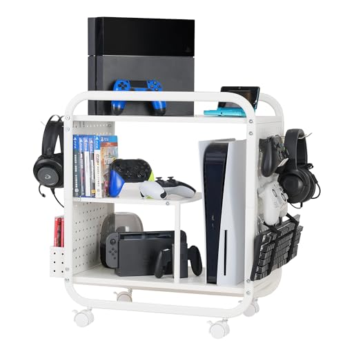 PLKOW Video Game Organizer, Rolling Video Game Storage Rack for Xbox/Switch/PS4/PS5 Accessories, Game Consoles Stand Controllers Holder, Perfect Holiday Present (White)