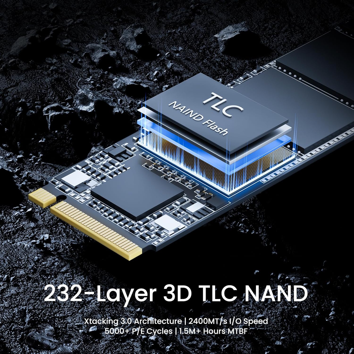 TLC 3D NAND Technology with 1200TBW Endurance: Unlike QLC’s 4-layer cells, our TLC flash (3-layer cells) delivers 3x higher P/E cycles and 1200TB total bytes written (TBW), ensuring durability for heavy workloads. Based on Yangtze Memory’s 232-layer 3D TLC with Xtacking 3.0 architecture, it offers 2400MT/s I/O speed and <150μs latency, outperforming QLC in both speed (7450MB/s read) and reliability